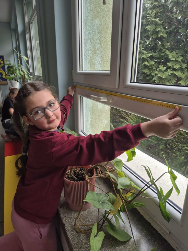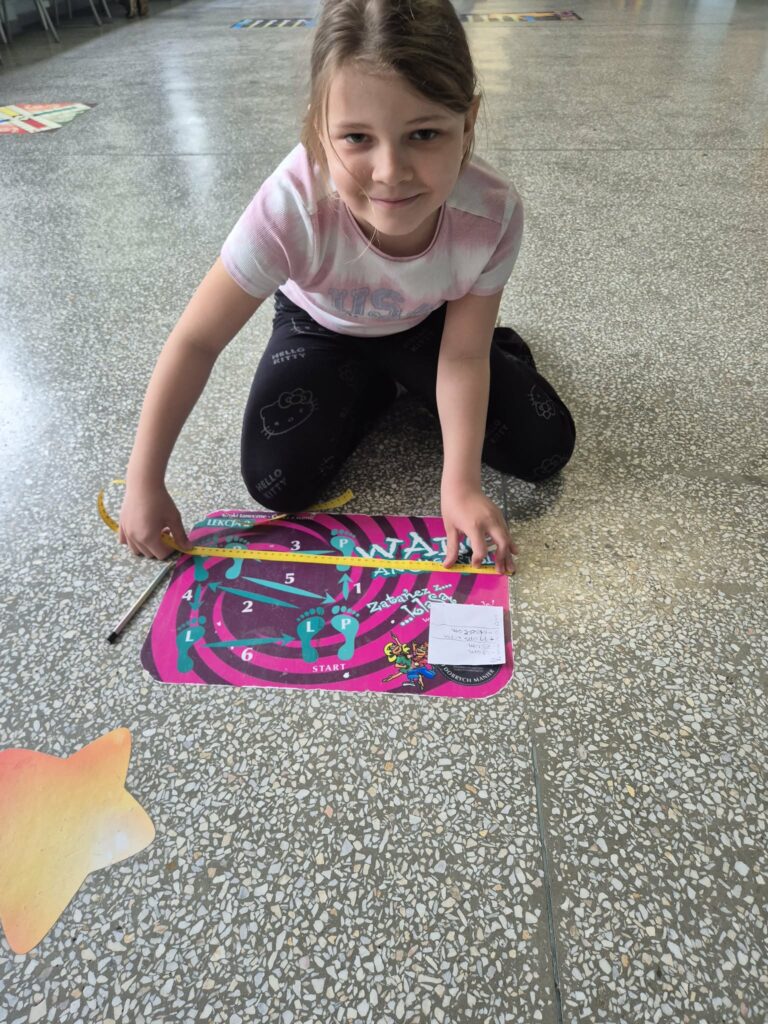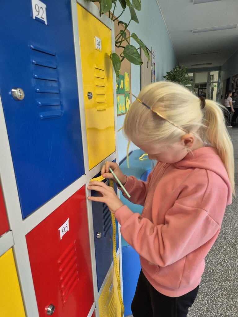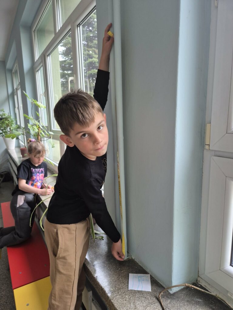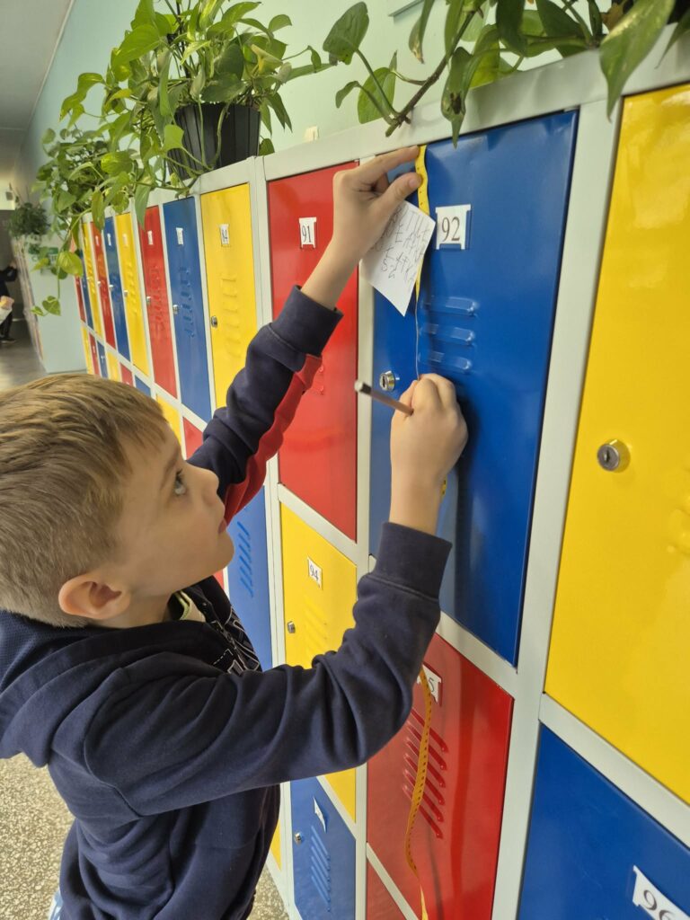 Uczniowie klasy 1a przekonali się o tym podczas dzisiejszych zajęć, zamieniając tradycyjne linijki na kolorowe miary krawieckie. To wyjątkowe ćwiczenie nie tylko rozwija wyobraźnię przestrzenną, ale uczy też precyzji, cierpliwości i sprawności manualnej. Nasz hol szkolny stał się prawdziwym poligonem doświadczalnym! Dzieci z wielkim zaangażowaniem sprawdzały wymiary szkolnego wyposażenia – z najwyższą starannością mierzyły długość i szerokość szafek, dbając o to, by miara idealnie przylegała do krawędzi. Mierzenie obwodu doniczki, stolika czy długości własnej nogi pozwoliło uczniom zrozumieć, że matematyka to nie tylko liczby w zeszycie, ale przede wszystkim praktyczne narzędzie, które otacza nas wszędzie. Jesteśmy dumni, patrząc na to, jak profesjonalnie nasi najmłodsi podeszli do roli małych inżynierów i projektantów!