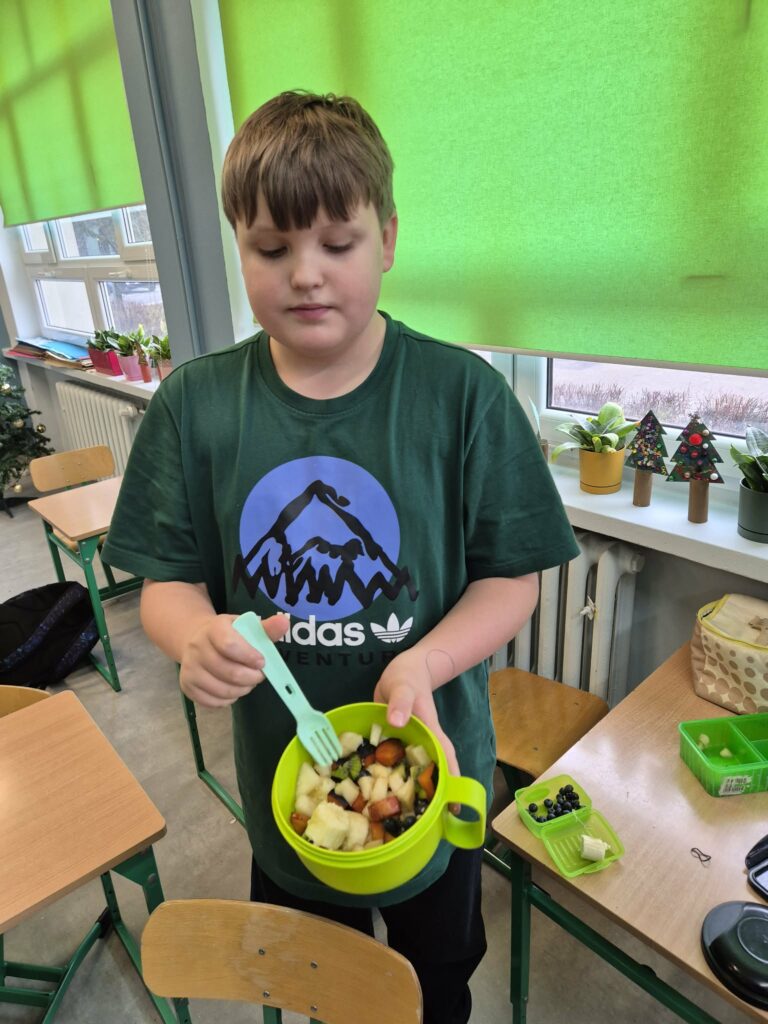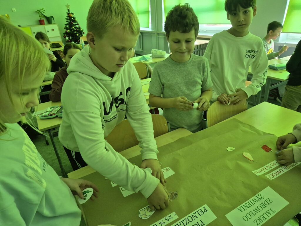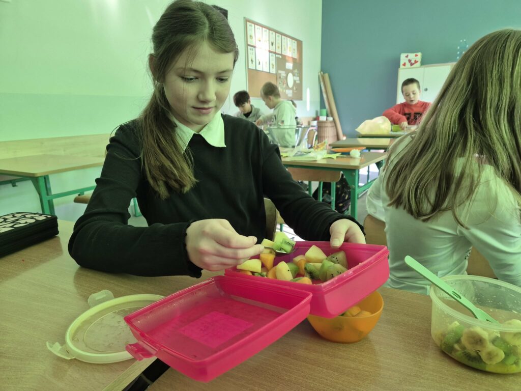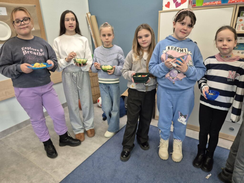Podczas zajęć z edukacji zdrowotnej uczniowie klas 4 poznali zasady zdrowego odżywiania na podstawie „Talerza Żywienia”. Wcześniej obliczali swoje BMI, ucząc się, jak dbać o zdrowie i prawidłową masę ciała. Zajęcia zakończyły się wspólnym przygotowaniem sałatki owocowej, które było praktycznym podsumowaniem zdobytej wiedzy.