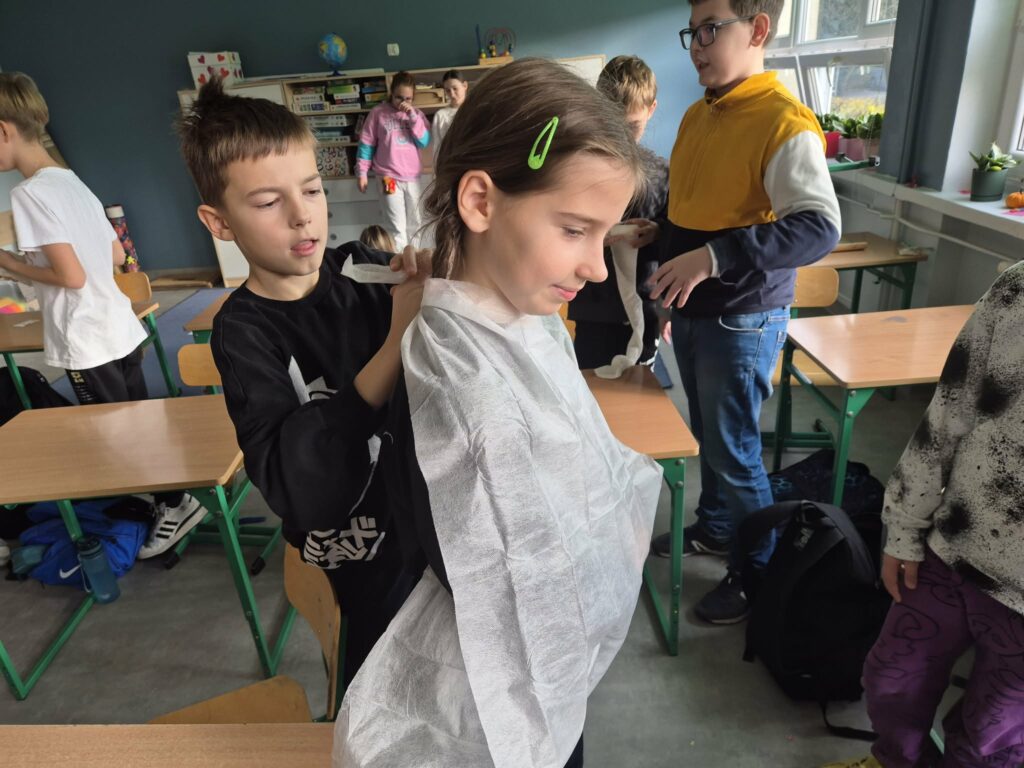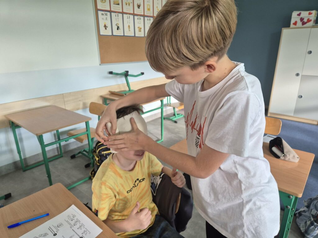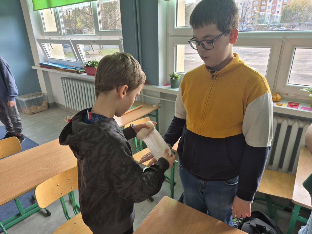 Podczas zajęć z edukacji zdrowotnej uczniowie klasy 4 uczestniczyli w praktycznych ćwiczeniach z zakresu pierwszej pomocy. Przypomnieli sobie podstawowe zasady reagowania w sytuacjach zagrożenia zdrowia i życia oraz uczyli się, jak prawidłowo udzielić pomocy poszkodowanym. Zajęcia zwiększyły ich świadomość i poczucie odpowiedzialności za bezpieczeństwo swoje i innych.