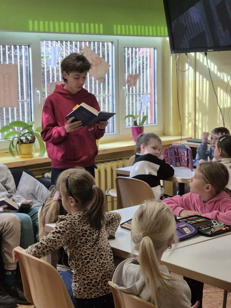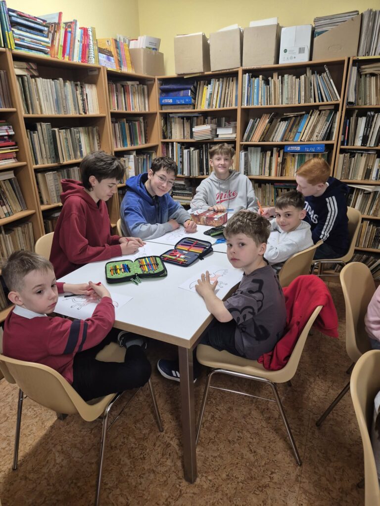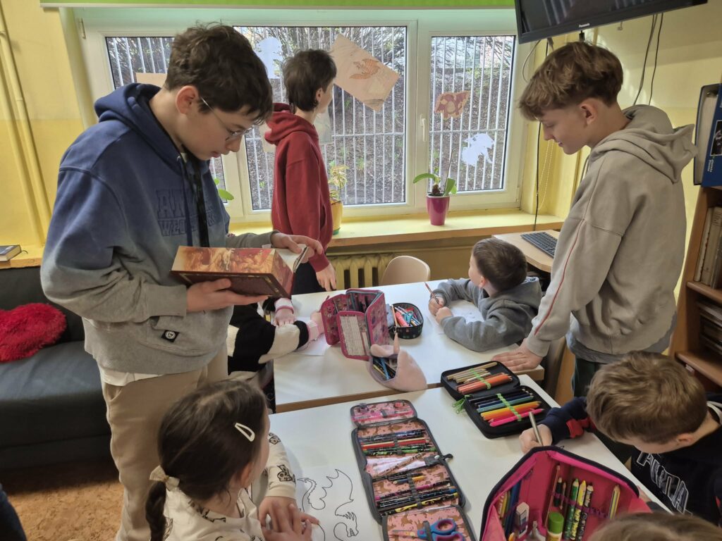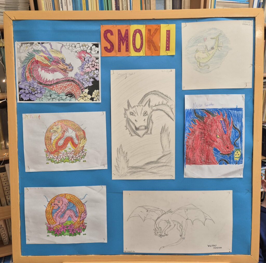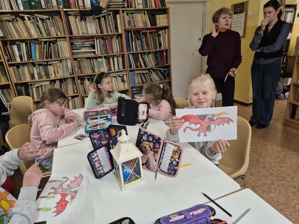 W naszej magicznej bibliotece odbyła się w czwartek niezwykła lekcja. Dzieci z klasy 1a uczestniczyły w zajęciach o smokach. Starsi uczniowie z klasy 6B oraz 7a czytali fragmenty o smokach z takich książek jak : ” Eragon” „Ziemiomorze”, „Harry Potter” czy „Hobbit”. Nastepnie dzieci wykonywały prace plastyczne na podstawie wysłuchanych wcześniej opisów.