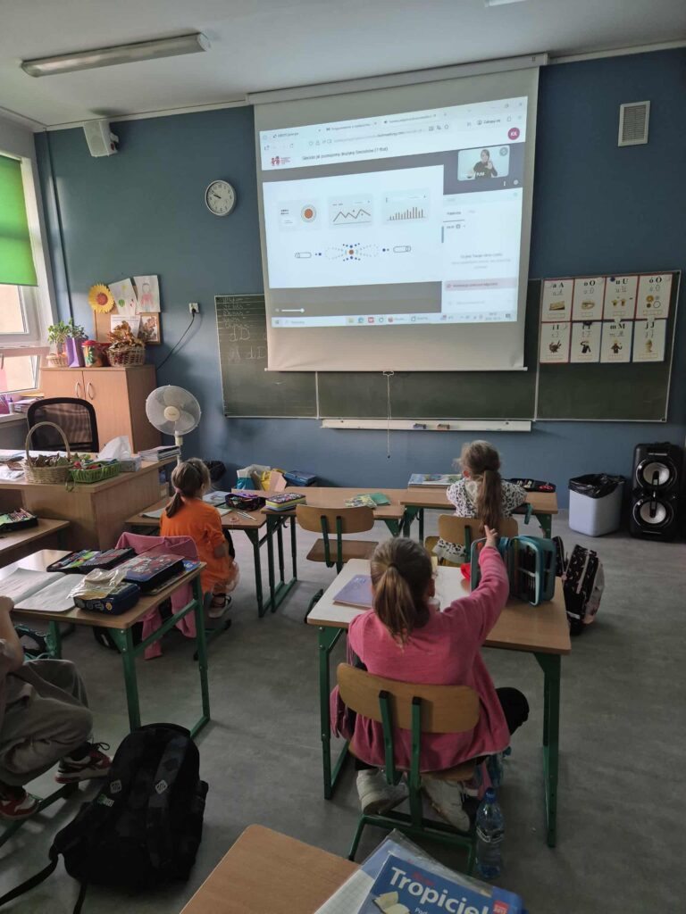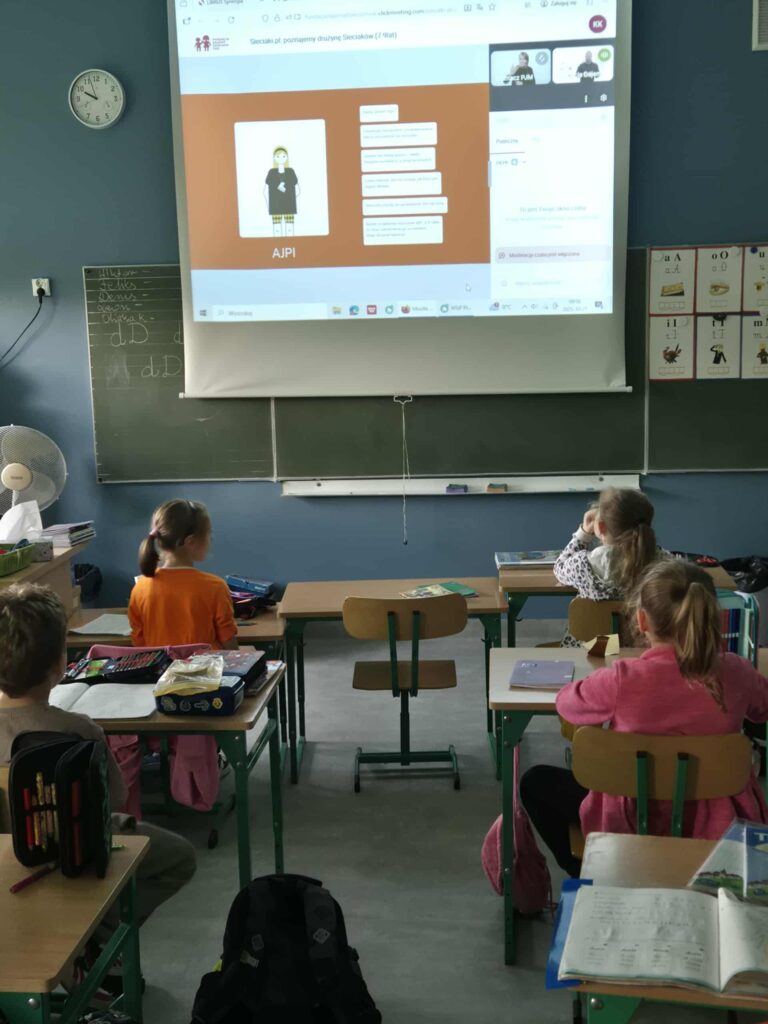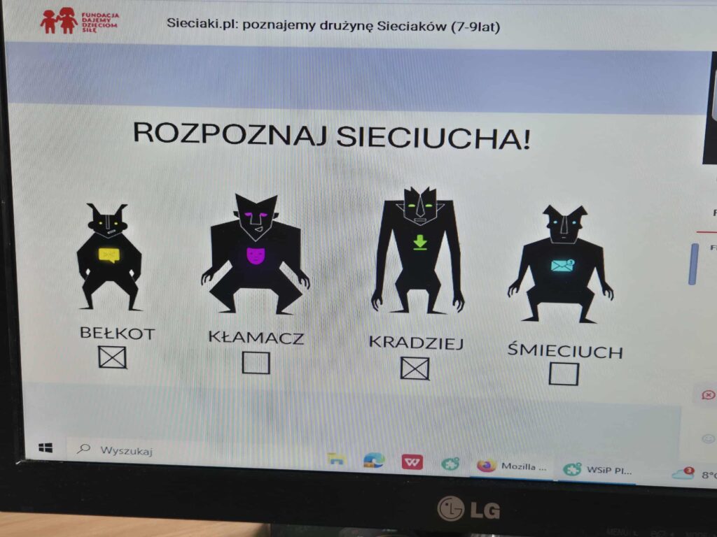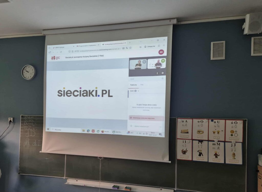 Klasa 1 a i pierwsza lekcja sieciakowa „Sieciaki.pl: poznajemy drużynę sieciaków”. Lekcje prowadzone na podstawie scenariuszy zapoznają uczniów i uczennice z przygodami Sieciaków, uczą zasad bezpieczeństwa online i zachęcają dzieci do dołączenia do sieciakowej drużyny. Zajęcia poświęcone są 5 zasadom bezpiecznego korzystania z internetu: — a) ograniczonego zaufania do osób poznanych w sieci. b) prywatności, c) równowadze w korzystaniu z internetu i urządzeń ekranowych, d) reagowaniu na zagrożenia, e) wzajemnego szacunku. Z niecierpliwością czekamy na kolejne spotkanie 🙂