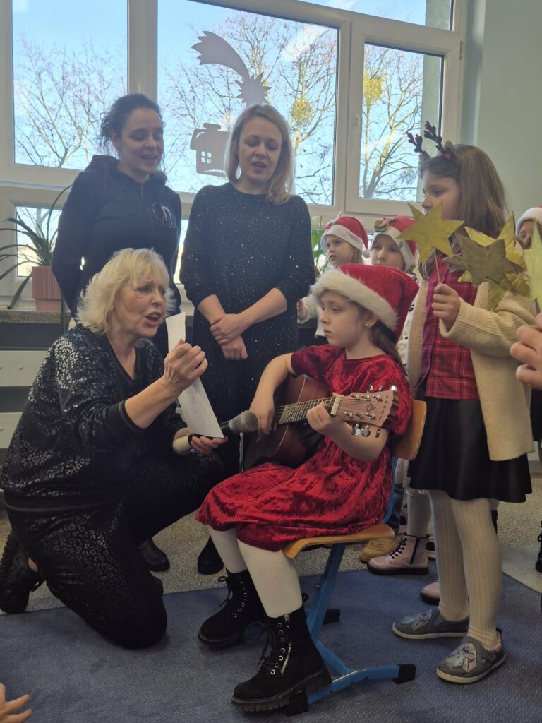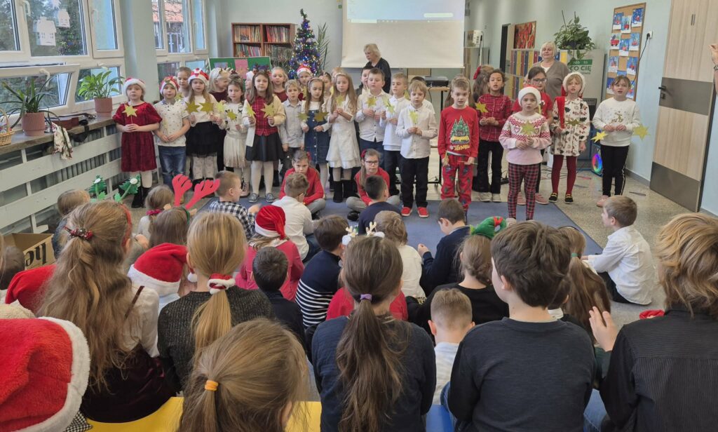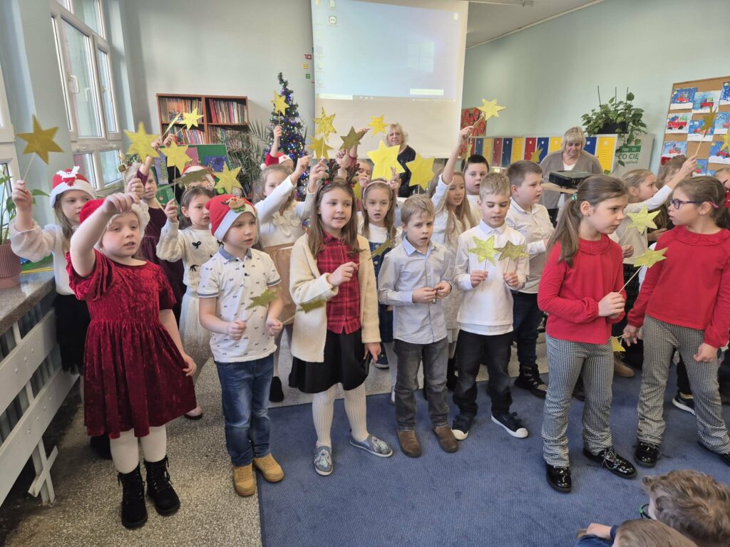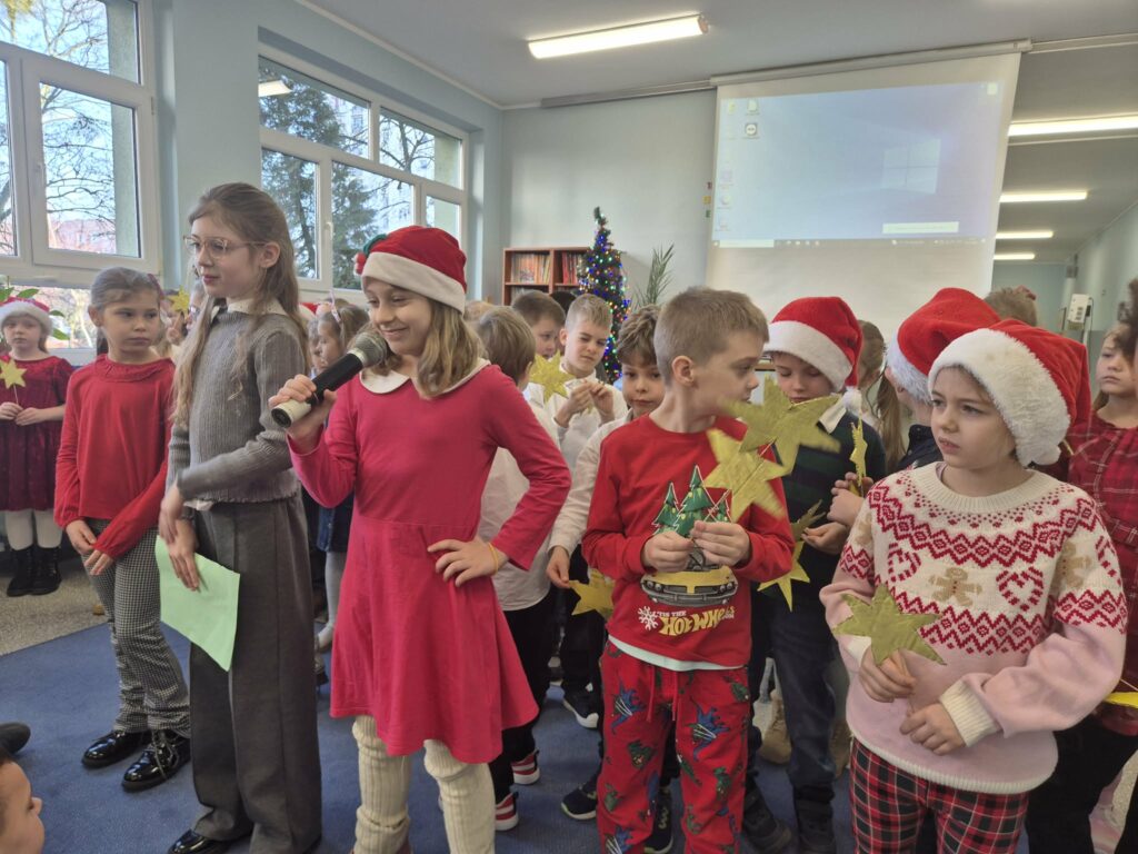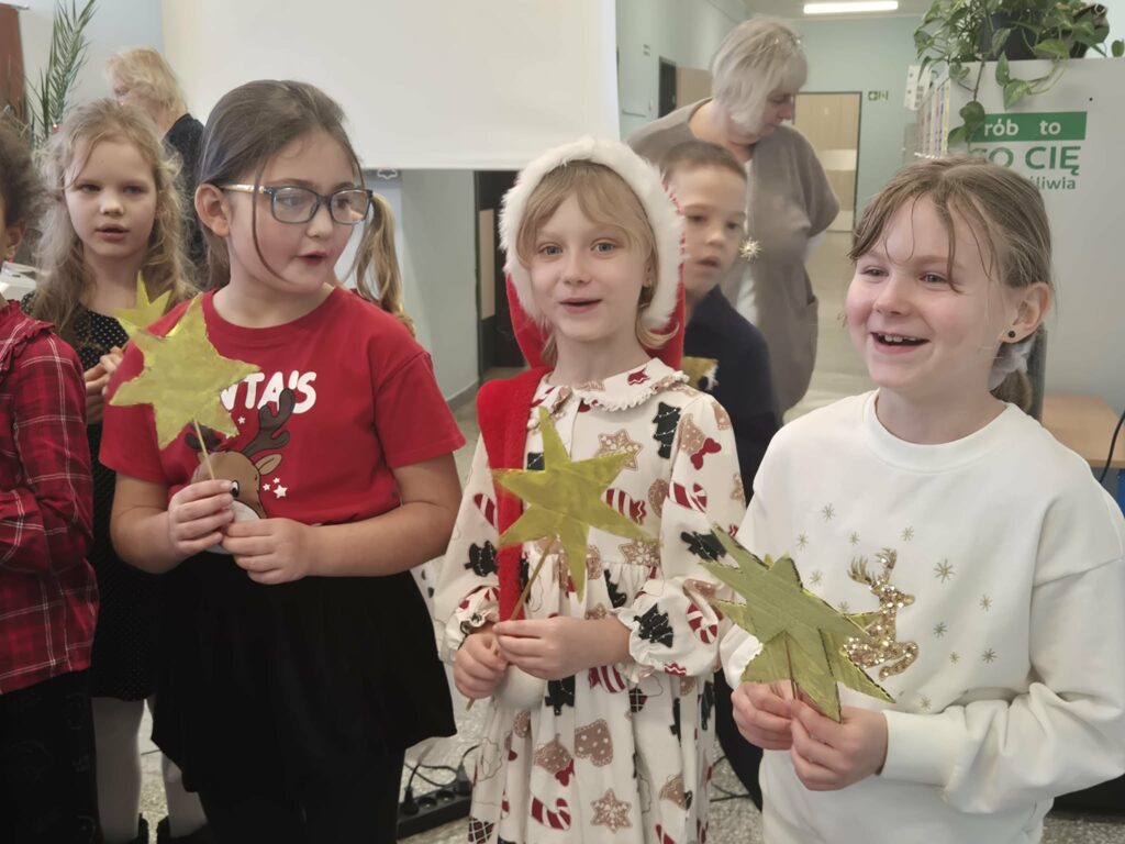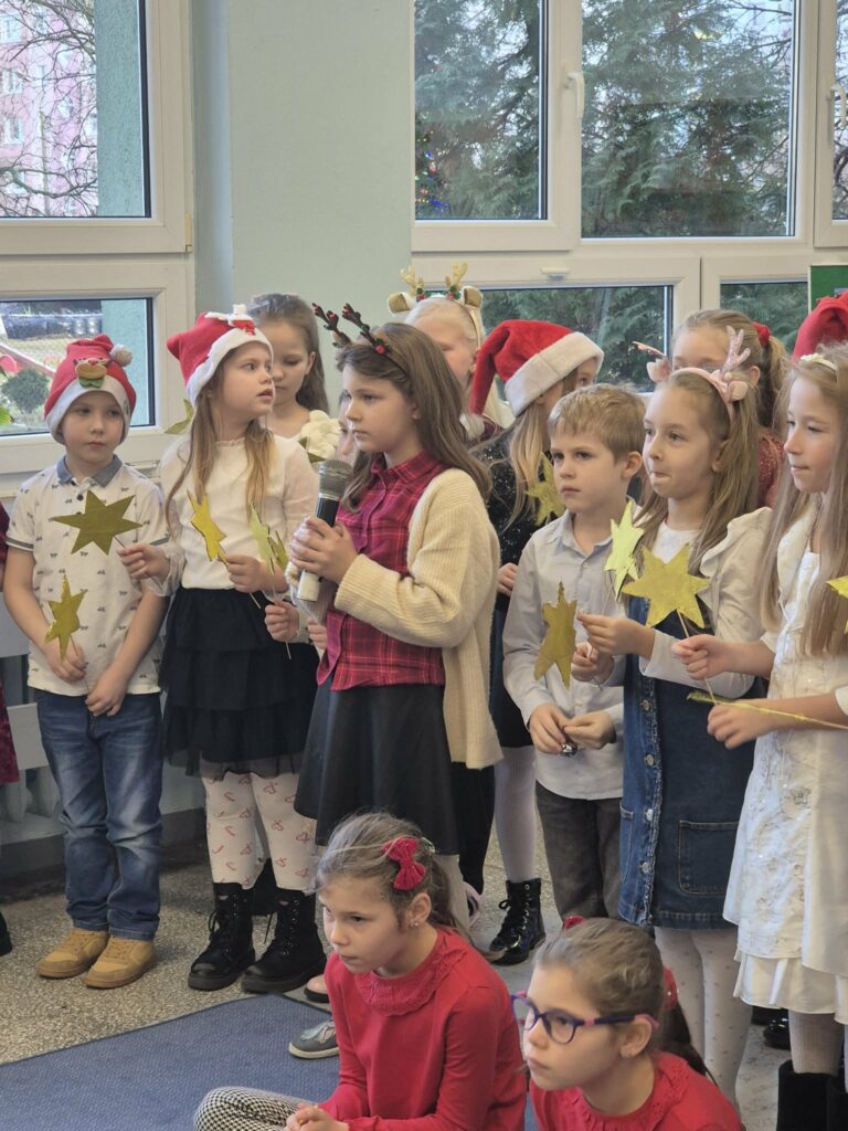Dzieci ze świetlicy zaprezentowały świąteczny występ w formie wspólnego kolędowania. Mali artyści z radością śpiewali tradycyjne kolędy, tworząc ciepłą i radosną atmosferę. Wydarzenie było piękną okazją do wspólnego przeżywania świątecznego czasu i integracji całej społeczności. 🎄