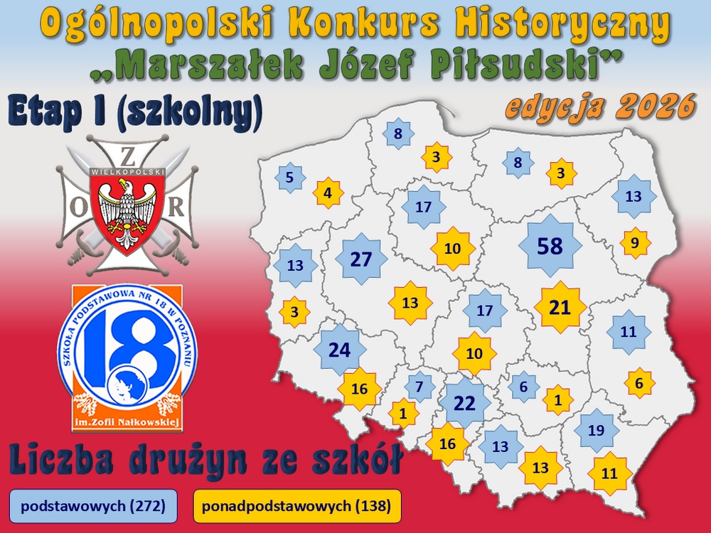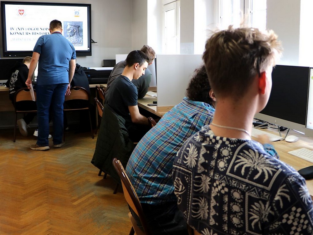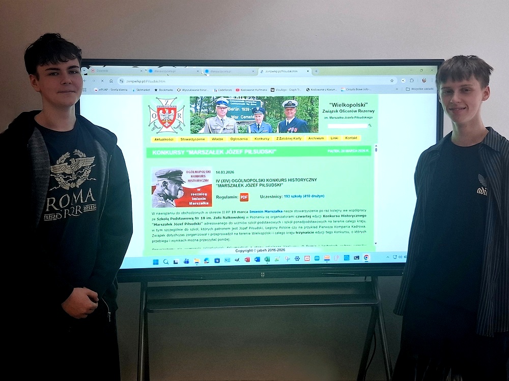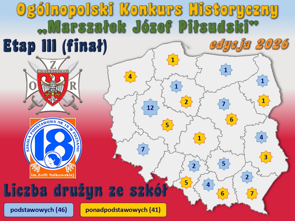 Nasza szkoła od blisko dekady we współpracy ze Związkiem Oficerów Rezerwy im. Marszałka Józefa Piłsudskiego jest – w nawiązaniu do obchodzonych 19 marcaw okresie II RP Imienin Marszałka – organizatorem czternastej, a o zasięgu ogólnopolskim czwartej edycji Konkursu Historycznego „Marszałek Józef Piłsudski” adresowanego, do uczniów szkół podstawowych i ponadpodstawowych, w tym szczególnie szkół, których patronem jest Józef Piłsudski, Legiony Polskie czy na przykład Pierwsza Kompania Kadrowa. Konkurs miał trzy etapy: szkolny, wojewódzki oraz finałowy. Ten ostatni miał miejsce w miniony piątek 20 marca 2026. Każdą szkołę mogły reprezentować dwuosobowe drużyny. Do etapu szkolnego w tegorocznej edycji zgłosiło się co najmniej 410 drużyn ze 193 szkół, natomiast etap wojewódzki uzyskawszy co najmniej 70 procent poprawnych odpowiedzi przeszło dalej do finału 87 drużyn, 46 reprezentujących szkoły podstawowe i 41 reprezentujących szkoły ponadpodstawowe. Komisja w składzie: Aldona Feder, Jacek Behrendt i Sławomir Brambor była mile zaskoczona wysokim poziomem wiedzy posiadanej przez wszystkich finalistów, szczególnie w grupie klasyfikacyjnej uczniów szkół ponadpodstawowych, w której aby znaleźć się w „dziesiątce” najlepszych należało uzyskać co najmniej 80 procent poprawnych odpowiedzi liczonych jako średnia z trzech finałowych testów rozwiązywanych przez każdą z drużyn (w grupie szkół podstawowych należało przekroczyć wartość 65 procent).